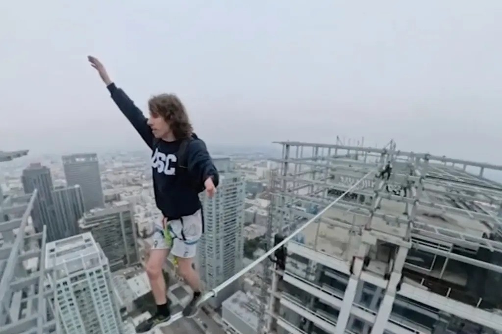 Ένα βίντεο που κόβει την ανάσα έχει κάνει τον γύρο του διαδικτύου, όπου φαίνεται ένας νεαρός να περπατά πάνω σε ένα τεντωμένο σκοινί, το οποίο είχε ισορροπήσει ανάμεσα σε δύο εγκαταλελειμμένους ουρανοξύστες του Λος Άντζελες.