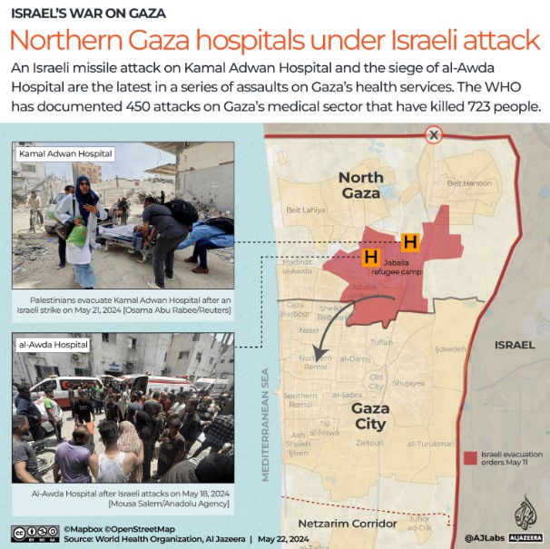 Στη βόρεια Γάζα, το νοσοκομείο Kamal Adwan παραμένει μη λειτουργικό και το νοσοκομείο al-Awda βρίσκεται υπό πολιορκία, ανέφερε.