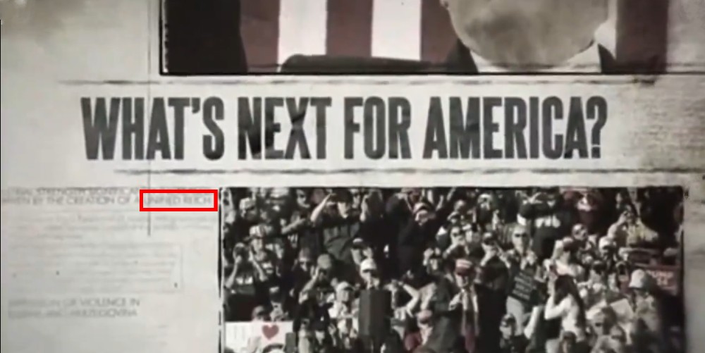 Ανάμεσα σε τίτλους όπως «Η οικονομία ανθεί!» και «Τα σύνορα έκλεισαν», ένας αναφέρει «τη δημιουργία ενός ενοποιημένου/εννιαίου Ράιχ». Το βίντεο σχολιάστηκε αρνητικά και από τον Τζορτζ Στεφανόπουλο(ς), ο οποιός είναι γνωστό στέλεχος των Δημοκρατικών με μακρά πορεία σε προεκλογικές καμπάνιες.