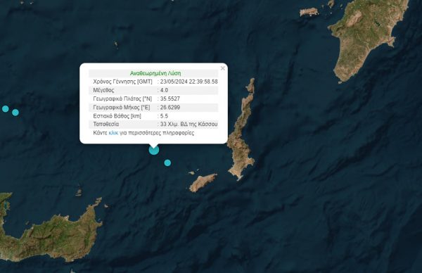 Στον υποθαλάσσιο χώρο της Κάσου, σε απόσταση 33 χιλιομέτρων βορειοδυτικά του νησιού, εντοπίζεται το επίκεντρο σεισμικής δόνησης 4 Ρίχτερ που σημειώθηκε σχεδόν μιάμιση ώρα μετά τα μεσάνυχτα.