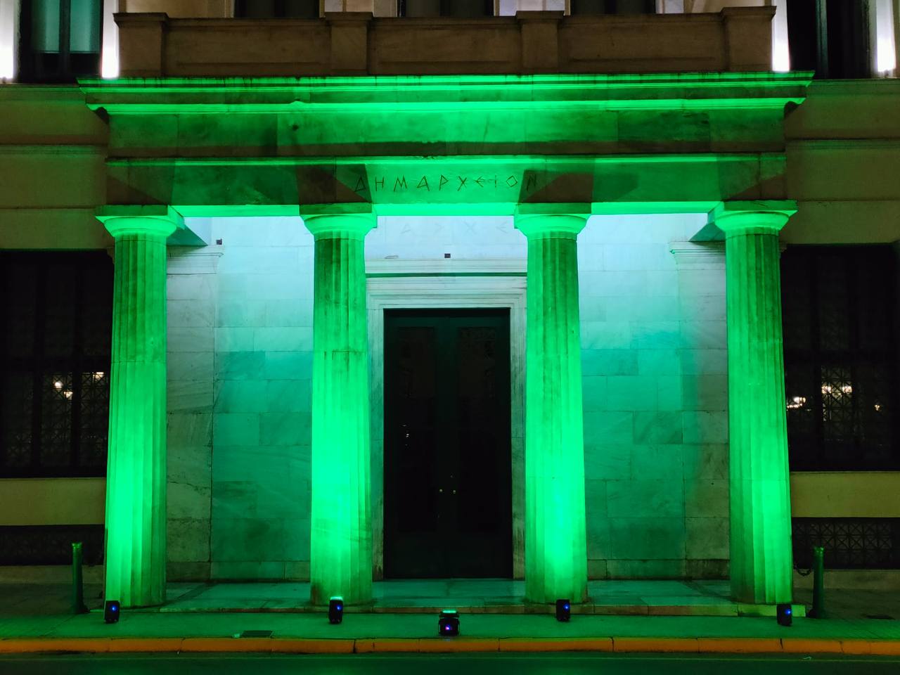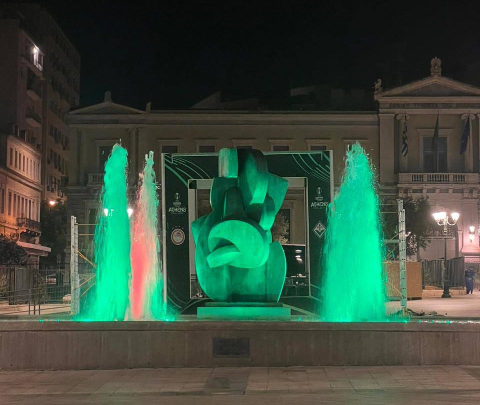 Το δημαρχείο της Αθήνας και το σιντριβάνι της πλατείας Κοτζιά φωτίστηκαν το βράδυ της Κυριακής, μετά το τέλος της αναμέτρησης, σε πράσινο χρώμα με εντολή του δημάρχου Χάρη Δούκα.