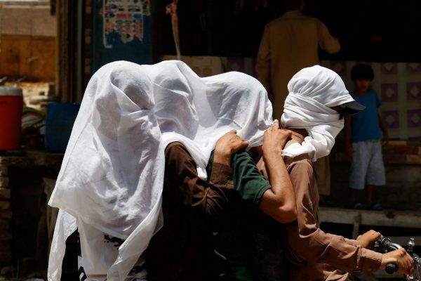 Τέσσερις επιβάτες σε μια μοτοσικλέτα, με καλυμέμνα τα κεφάλια τους με ένα βρεγμένο πανί για να δροσιστούν και να αποφύγουν την ηλιακή ακτινοβολία, κατά τη διάρκεια μιας καυτής καλοκαιρινής ημέρας, καθώς ο καύσωνας συνεχίζεται στο Τζακομπαμπάντ του Πακιστάν στις 26 Μαΐου 2024. REUTERS/Akhtar Soomro
