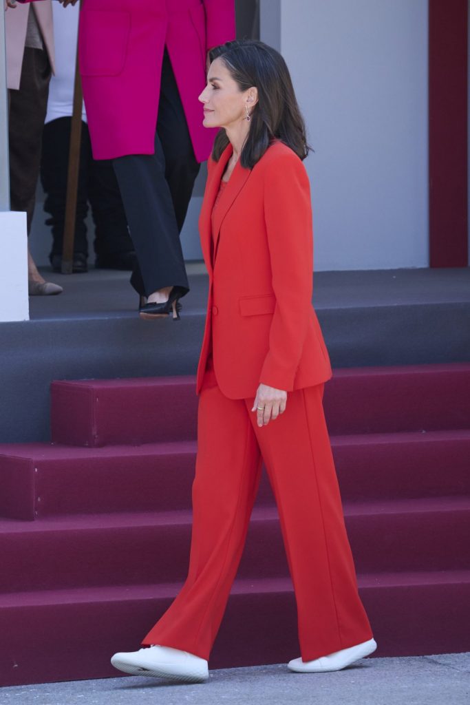 Το κοστούμι, σε έντονο κόκκινο χρώμα, περιλάμβανε ένα μεσάτο blazer και wide-leg παντελόνι, αποπνέοντας κομψότητα και δυναμισμό. Η εμφάνιση αυτή πραγματοποιήθηκε κατά τη διάρκεια της Εθνικής Ημέρας των Ενόπλων Δυνάμεων της Ισπανίας.