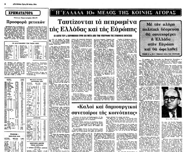 Η Ελλάς προσέρχεται στην Ευρώπη με την βεβαιότητα ότι στα πλαίσια της ευρωπαϊκής αλληλεγγύης εμπεδώνεται για όλα τα μέρη η εθνική ανεξαρτησία, κατοχυρώνονται οι δημοκρατικές ελευθερίες, επιταχύνεται η οικονομική ανάπτυξη και γίνεται, με την συνεργασία όλων, κοινός καρπός η κοινωνική και οικονομική πρόοδος.