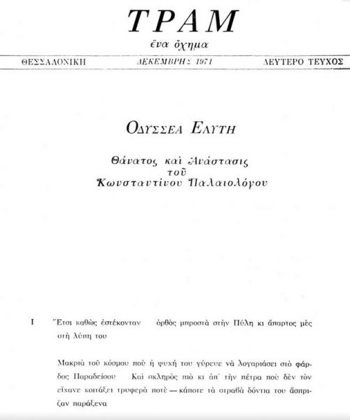 Το κείμενο αυτό, γραμμένο το 1969, υπήρξε το πρώτο που δημοσίευσε ο Ελύτης στην Ελλάδα μετά την επιβολή της απριλιανής δικτατορίας, στο περιοδικό «Τραμ», που εξέδιδε ο λογοτέχνης και μεταφραστής Δημήτρης Καλοκύρης στη Θεσσαλονίκη.