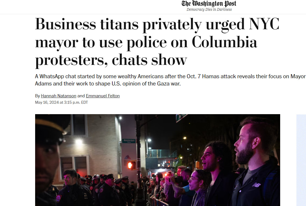 Αντισημιτικό χαρακτήρισαν φιλοϊσραηλινοί κροίσοι, αλλά και ο ίδιος δήμαρχος της Νέας Υόρκης ρεπορτάζ της Washington Post που αποκάλυπτε υπόγειες δραστηριότητες επηρεασμού της κοινής γνώμης υπέρ του Ισραήλ, παρά τις σφαγές που επιδίδεται στη Λωρίδα της Γάζας.