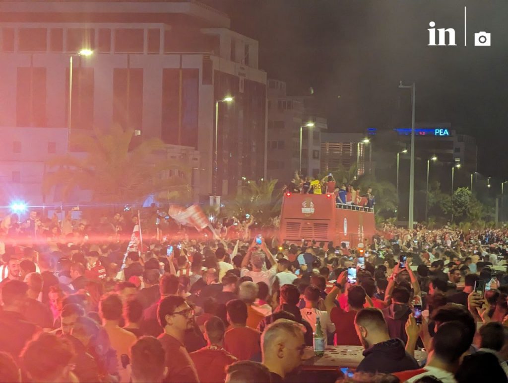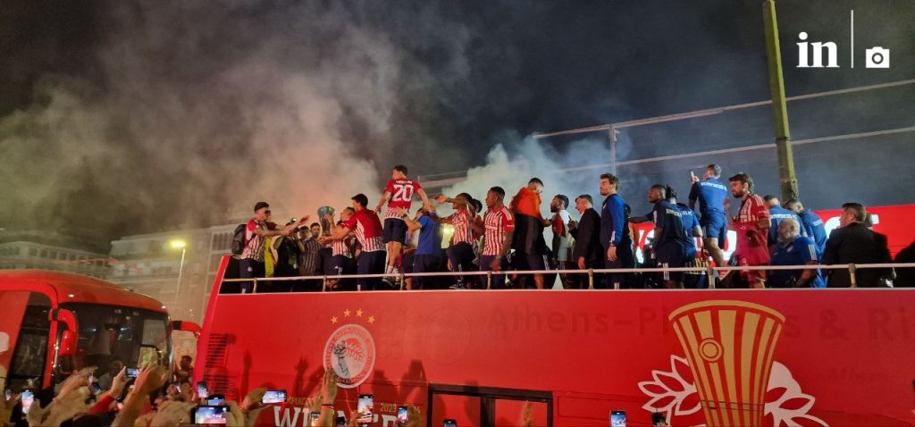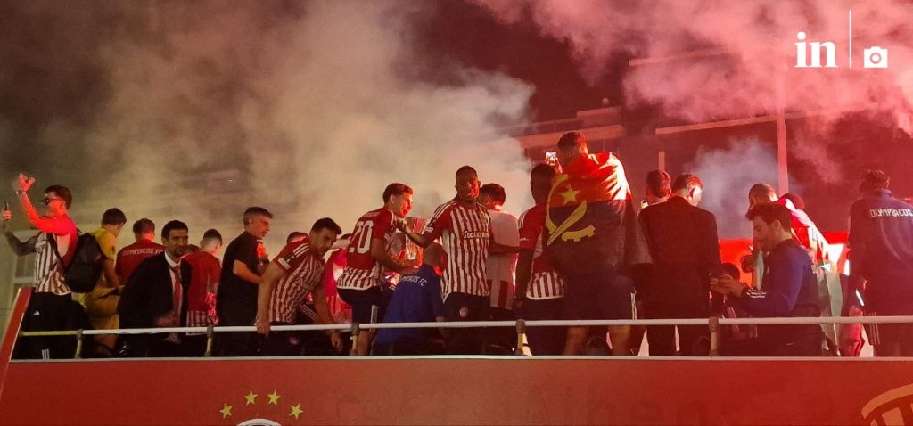 Την αποθέωση γνώρισαν οι ποδοσφαιριστές του Ολυμπιακού στη λεωφόρο Συγγρού όπου βρέθηκαν για να αφήσουν το πούλμαν της αποστολής και να επιβιβαστούν στο ειδικά διαμορφωμένο λεωφορείο των πανηγυρισμών.