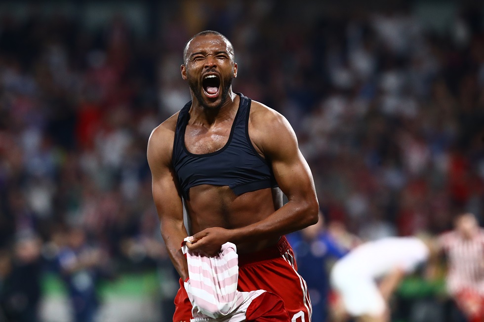 Εκστασιασμένος ο Αγιούμπ Ελ Κααμπί μετά την κατάκτηση του Europa Conference League από τον Ολυμπιακό.