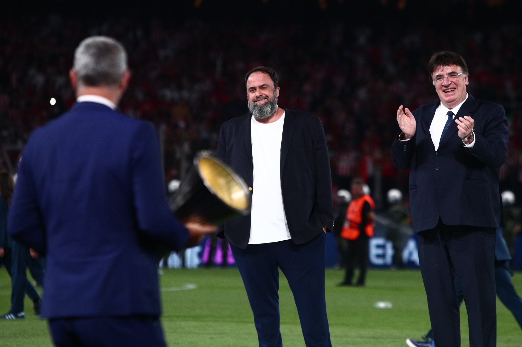 Ο ισχυρός άνδρας της ομάδας του Πειραιά αγκάλιασε όλους τους παίκτες, έδωσε συγχαρητήρια σε όλους και απόλαυσε τις πιο ένδοξες στιγμές της ιστορίας του συλλόγου.