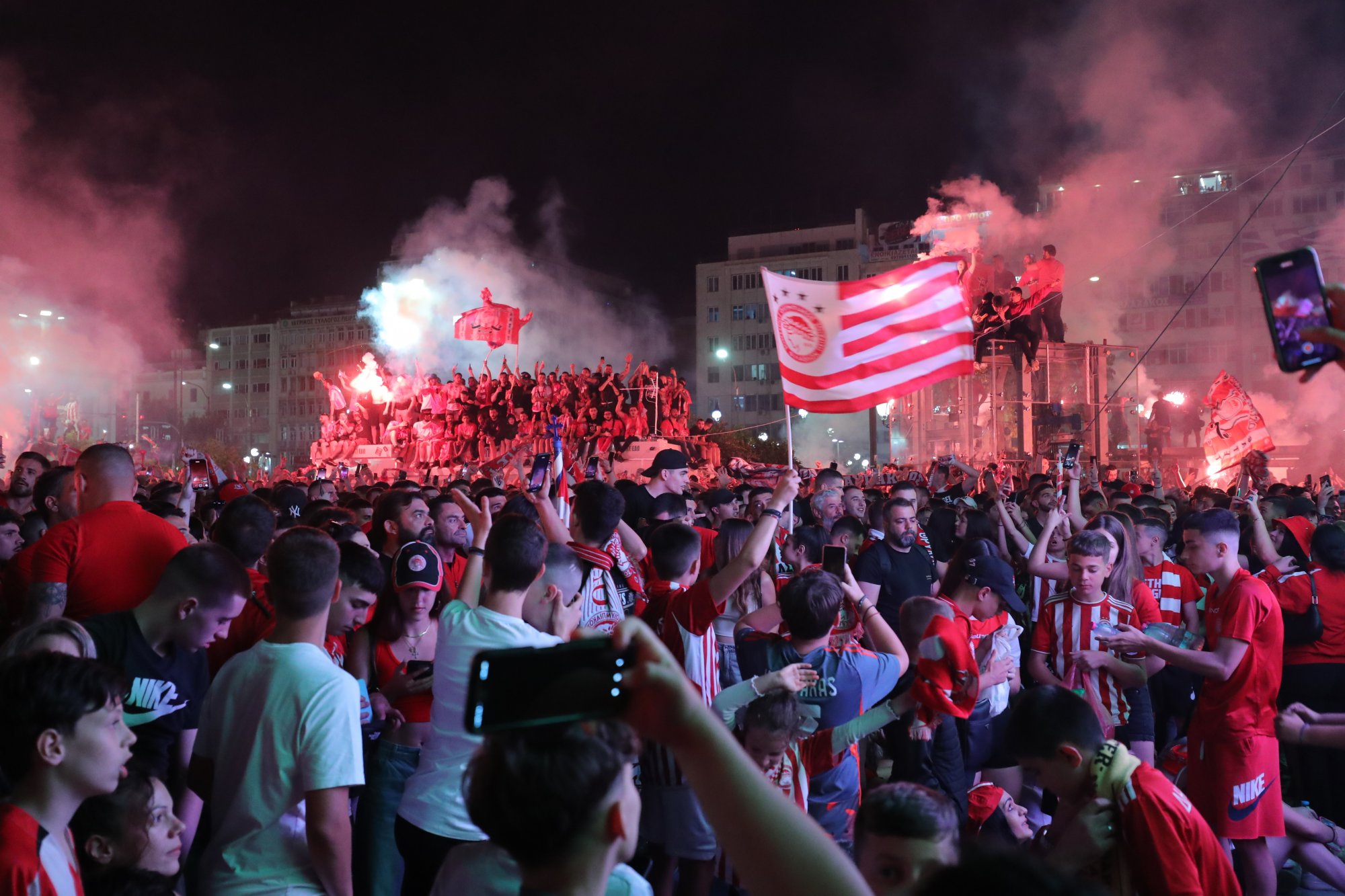 Με επίκεντρο τον Πειραιά, από την Αλεξανδρούπολη έως την Κρήτη και από την Κέρκυρα, ως την Αλόννησο και τη Λήμνο, μικροί και μεγάλοι, στα ερυθρόλευκα χρώματα, μεθυσμένοι από το νέκταρ της επιτυχίας πανηγύρισαν τη θριαμβευτική επικράτηση του Ολυμπιακού στον τελικό επί της Φιορεντίνα.