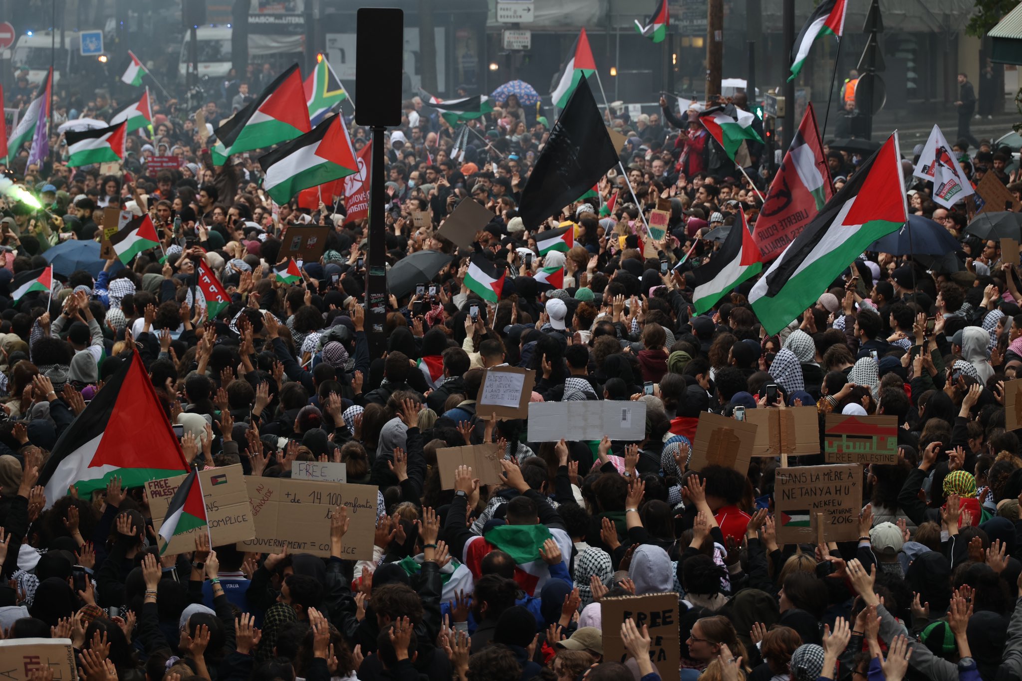 Οι διαδηλωτές στο Παρίσι φώναζαν συνθήματα όπως «ζήτω ο αγώνας του παλαιστινιακού λαού», «αυτός δεν είναι πόλεμος, είναι γενοκτονία», «το Ισραήλ δολοφονεί τα παιδιά της Παλαιστίνης».