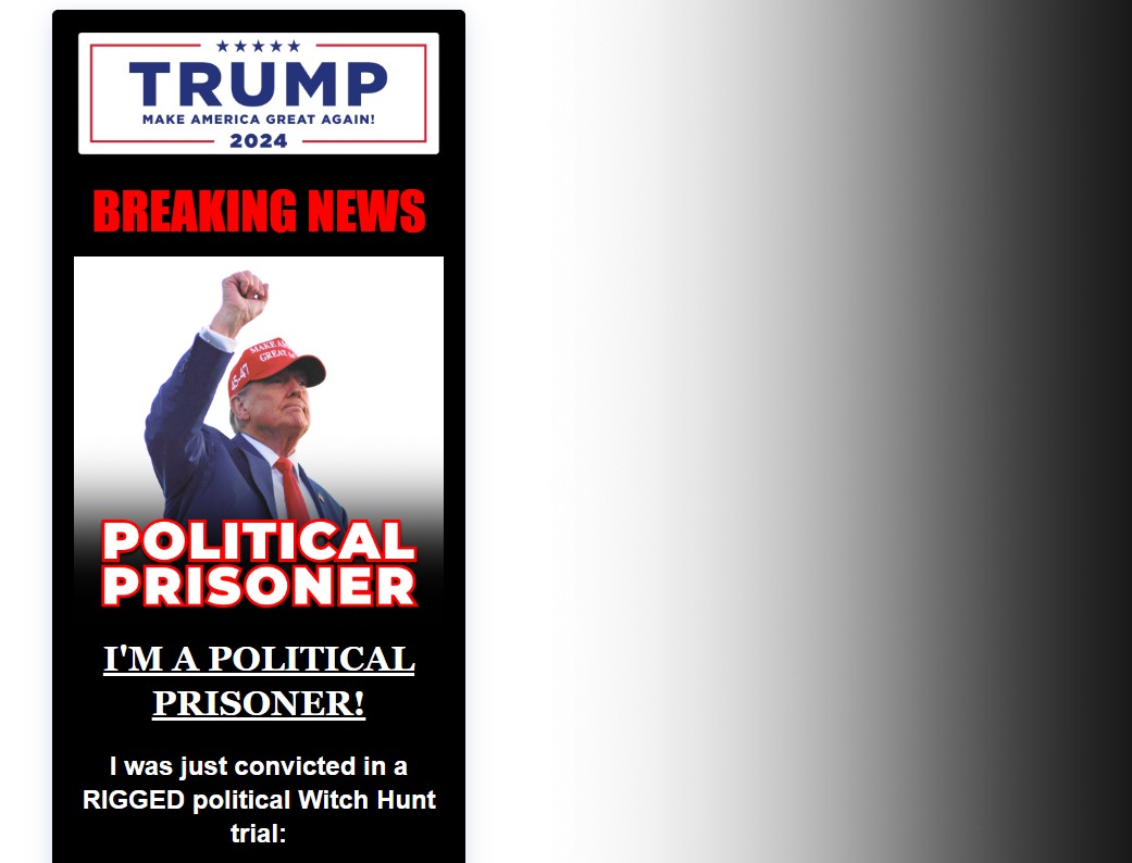 Μια ματιά στον ιστότοπο του Ντόναλντ Τραμπ εμφανίζει στα αριστερά τις φράσεις «Πολιτικός κρατούμενος» και «Είμαι πολιτικός κρατούμενος», «Μόλις καταδικάστηκα σε μια στημένη πολτική δίκη – κυνήγι μαγισσών», «Δεν έκανα τίποτα λάθος», «Έκαναν έφοδο στο σπίτι μου, με συνέλαβαν, έβγαλαν τη φωτογραφία μου και τώρα μόλις με καταδίκασαν!», το παραλήρημα συνεχίζεται λέγοντας πως «Ο απατεώνας Joe Biden πρέπει να πάρει το μήνυμα – εδώ και τώρα – ότι οι πιθανότητες του για μια 2η θητεία τελειώνουν ΣΗΜΕΡΑ!».
