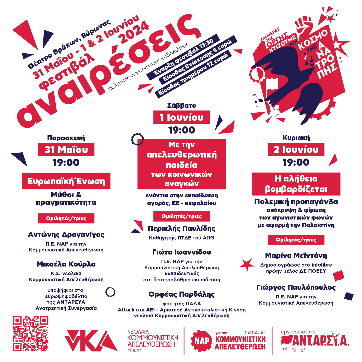 Στο Θέατρο Βράχων θα ανανεώσει το ετήσιο ραντεβού του για τις 31 Μαΐου, 1 και 2 Ιουνίου, το φεστιβάλ Αναιρέσεις, με τους οργανωτές του να υπόσχονται μια «δυναμική επιστροφή κόντρα σε κυβέρνηση, κεφάλαιο, κράτος και πρυτανικές αρχές που έχουν βαλθεί να εξαφανίσουν τα πολιτικά – πολιτιστικά φεστιβάλ.»