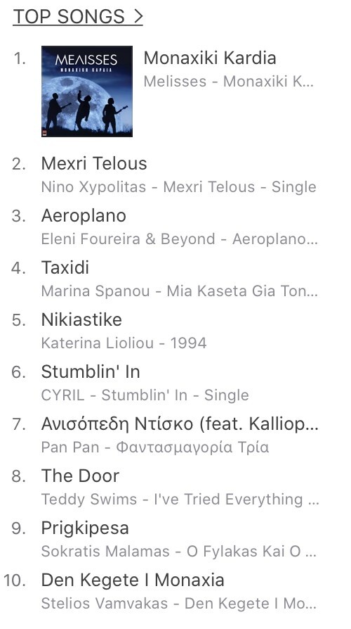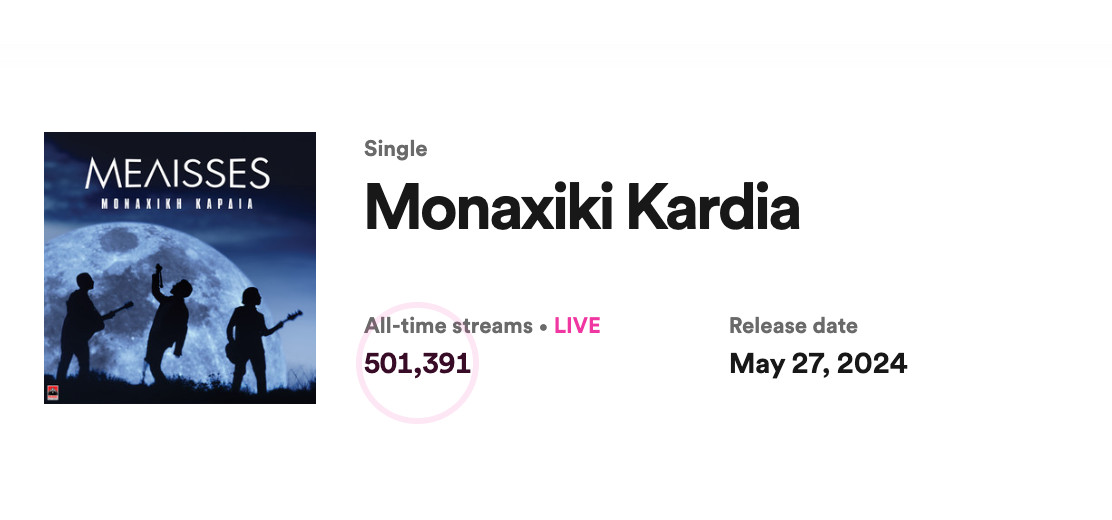 Ταυτόχρονα, είναι no1 και εξώφυλλο στη Spotify playlist «New Music Friday» με τις πιο εμπορικές νέες κυκλοφορίες της εβδομάδας, ενώ παραμένει επί μακρόν στο no1 του ελληνικού iTunes Top 100 chart.