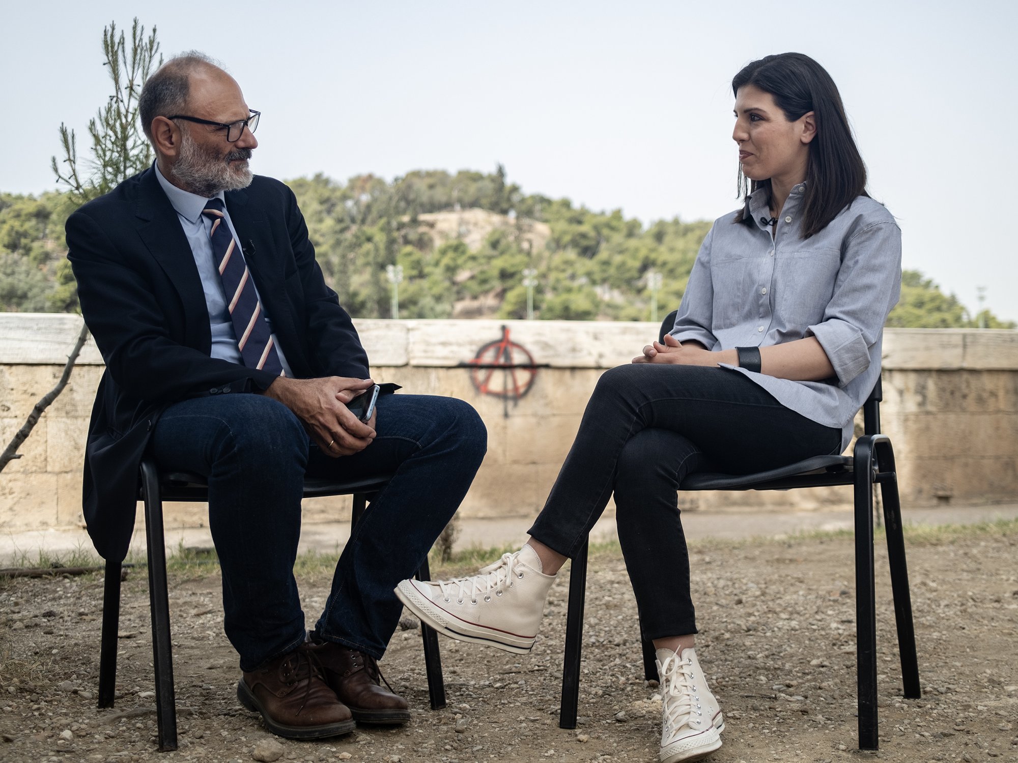 Η υποψήφια ευρωβουλεύτρια με τη Νέα Αριστερά Έλενα-Όλγα Χρηστίδη με τον δημοσιογράφο του in Παναγιώτη Σωτήρη