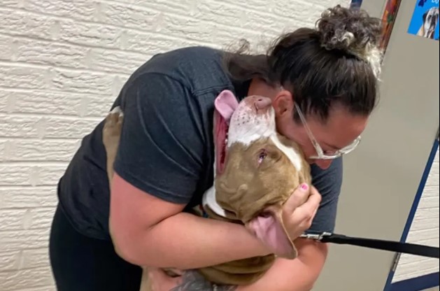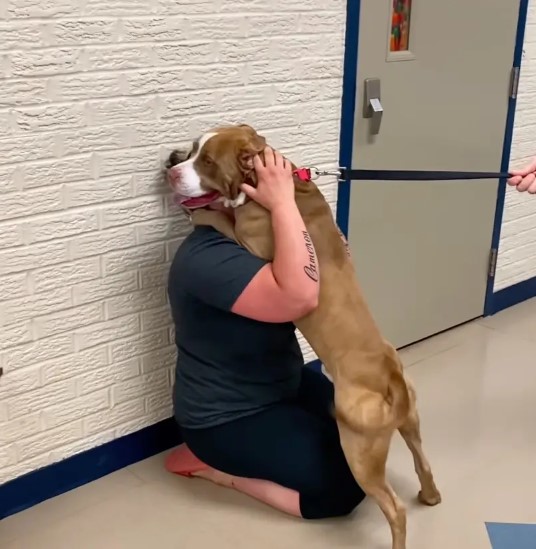 Το χαρούμενο πίτμπουλ πήδηξε επάνω στην Πάουερς μόλις την είδε, γεμίζοντάς την σάλια μη μπορώντας μάλλον ούτε εκείνο να πιστέψει ότι την βλέπει έπειτα από δύο ολόκληρα χρόνια.