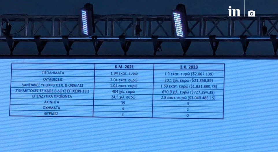 Στη συνέχεια παρουσίασε στις οθόνες, κατά την ομιλία του, τα εισοδήματά του το 2023 σε σύγκριση με αυτά του Κυριάκου Μητσοτάκη το 2021, όπως και τις καταθέσεις, δανειακές υποχρεώσεις και οφειλές, συμμετοχές σε κάθε είδους επιχειρήσεις, επενδυτικά προϊόντα, ακίνητα, οχήματα και θυρίδες.