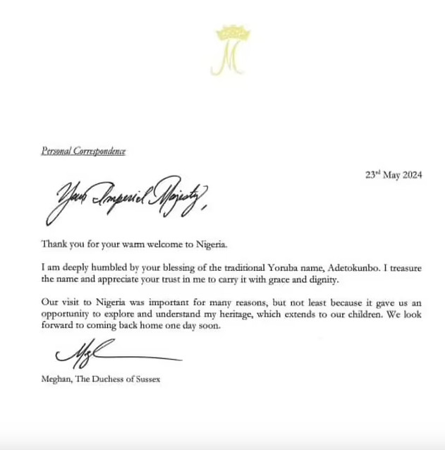Στα τέλη Μαΐου, η Μέγκαν Μαρκλ έγραψε στον ηγέτη για να τον ευχαριστήσει για τη φιλοξενία του και που την τίμησε με ένα νιγηριανό όνομα.