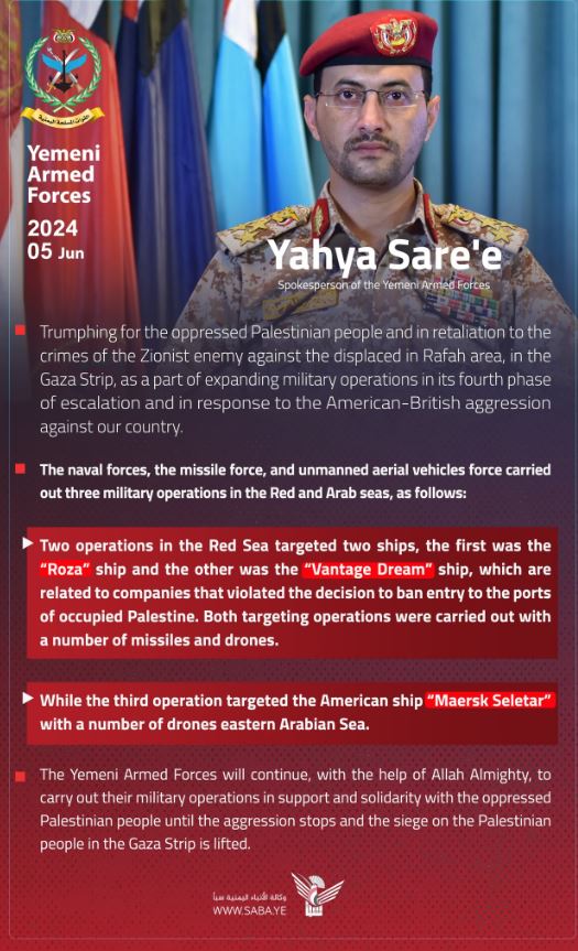 «Οι δύο εταιρείες παραβίασαν την απόφαση (των Χούθι) που απαγόρευσε την είσοδο πλοίων στα λιμάνια της κατεχόμενης Παλαιστίνης (Ισραήλ)», είπε. «Η τρίτη επιχείρηση στόχευσε το αμερικανικό πλοίο MAERSK SELETAR με έναν αριθμό μη επανδρωμένων αεροσκαφών στο ανατολικό τμήμα της Αραβικής Θάλασσας», πρόσθεσε.