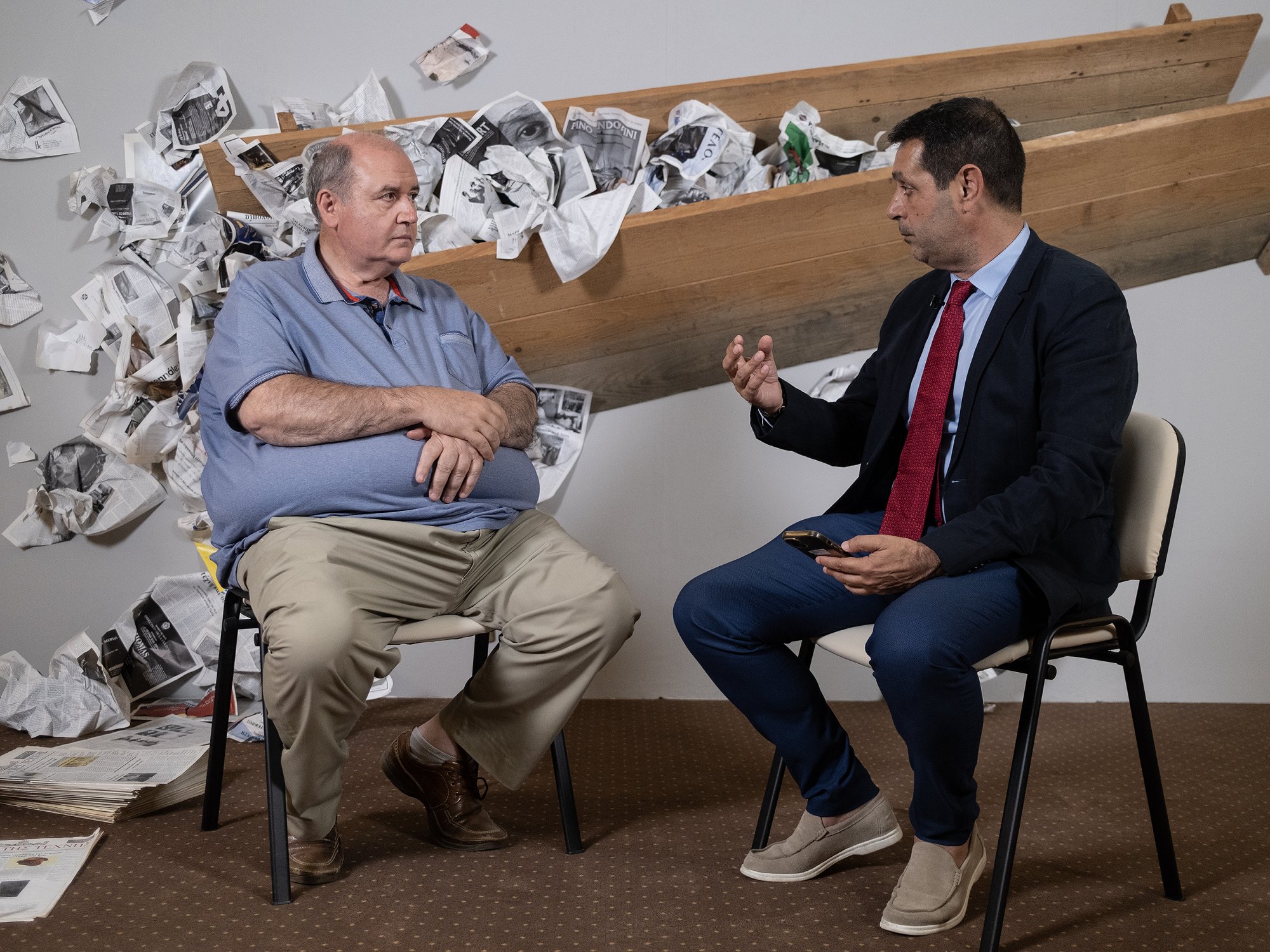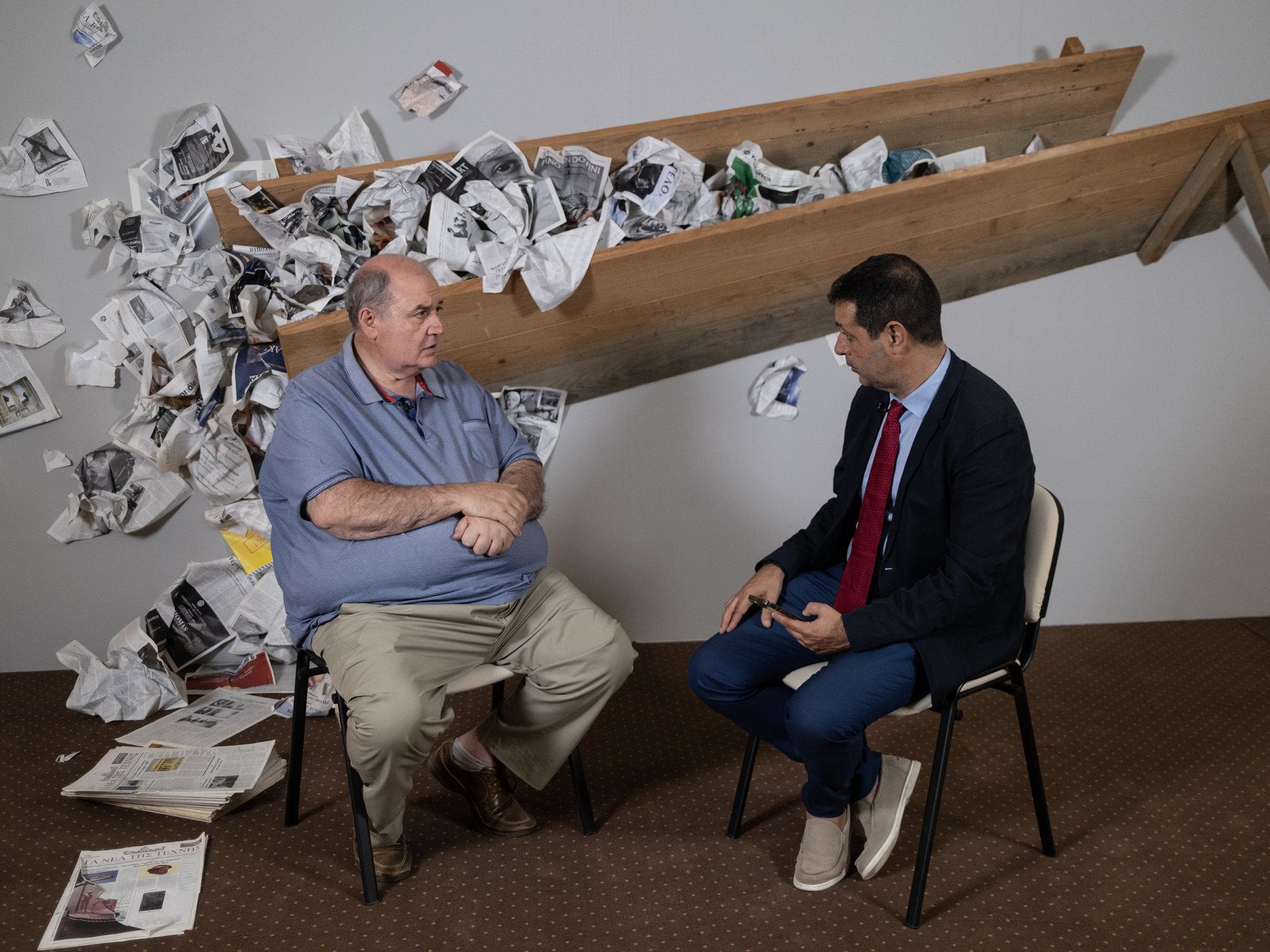 O υποψήφιος ευρωβουλευτής της Νέας Αριστεράς κ. Νίκος Φίλης με τον δημοσιογράφο του in κ. Ανδρέα Παναγόπουλο στην βιβλιοθήκη της ΕΣΗΕΑ που φιλοξενούσε εικαστική επέμβαση του Κώστα Τσόκλη