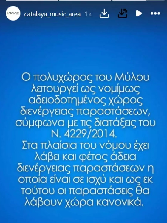 «Ο Πολυχώρος του Μύλου λειτουργεί ως νομίμως αδειοδοτημένος χώρος διενέργειας παραστάσεων, σύμφωνα με τις διατάξεις του Ν. 4229/2014. Στα πλαίσια του νόμου έχει λάβει και φέτος άδεια διενέργειας παραστάσεων η οποία είναι σε ισχύ και ως εκ του οι παραστάσεις θα λάβουν χώρα κανονικά».