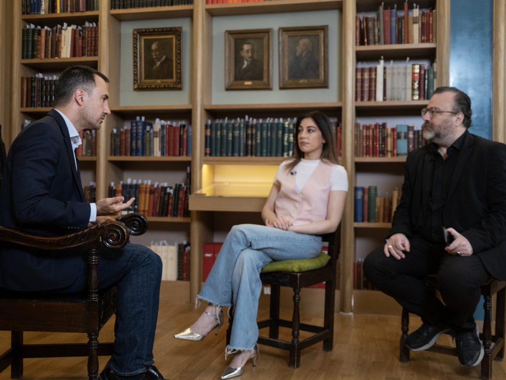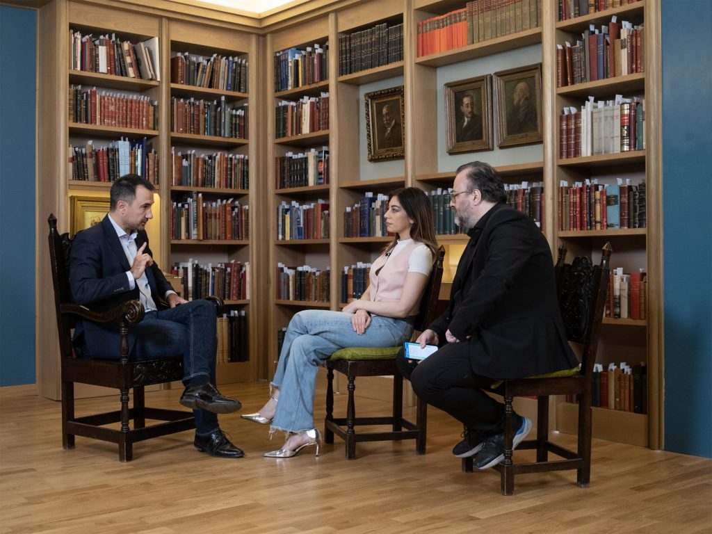 Ο πρόεδρος της ΚΟ της Νέας Αριστεράς Αλέξης Χαρίτσης με τους δημοσιογράφους του in, Δημήτρη Μανιάτη και Ελένη Στεργίου