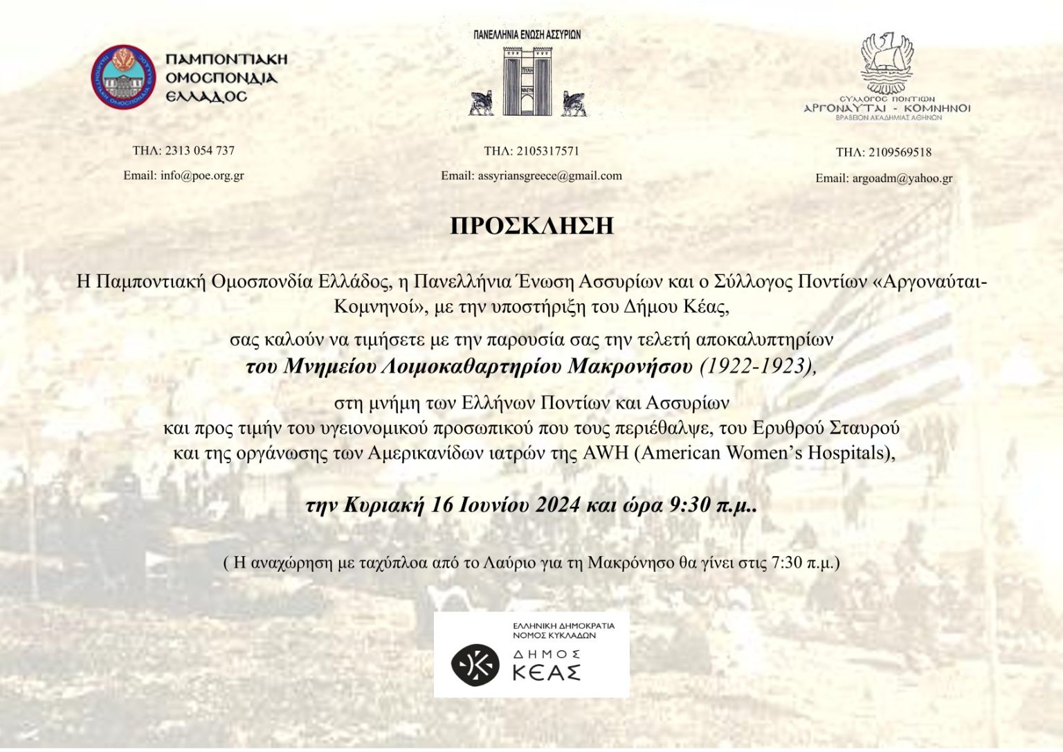 Την Κυριακή 16 Ιουνίου 2024 και ώρα 9:30 στη Μακρόνησο, η Παμποντιακή Ομοσπονδία Ελλάδος (Π.Ο.Ε.), η Πανελλήνια Ένωση Ασσυρίων και ο Σύλλογος Ποντίων «Αργοναύται-Κομνηνοί», θα πραγματοποιήσουν τα αποκαλυπτήρια του Μνημείου, που ανεγέρθηκε στο χώρο του Λοιμοκαθαρτηρίου, στο Ν.Δ. άκρο του νησιού.