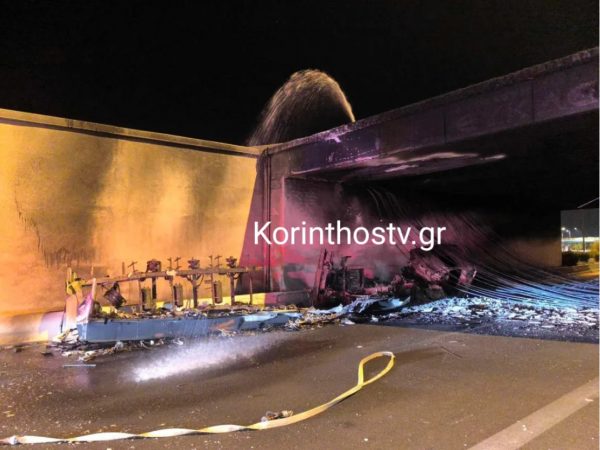 Το βράδυ χθες Παρασκευή ξέσπασε φωτιά στο 75,5ο χλμ της Αθηνών-Κορίνθου, στο ύψος της γέφυρας του Ισθμού, έπειτα από ανατροπή βυτιοφόρου.