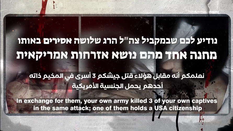 Δεν έδωσε στη δημοσιότητα τα ονόματα των σκοτωμένων, αλλά ένα βίντεο που δόθηκε στη δημοσιότητα έδειχνε ότι επρόκειτο για τρία πτώματα τους οποίους παρουσίασε με θολά τα πρόσωπά τους. «Οι αιχμάλωτοί σας δεν θα απελευθερωθούν αν δεν απελευθερωθούν οι δικοί μας αιχμάλωτοι», ανέφερε.
