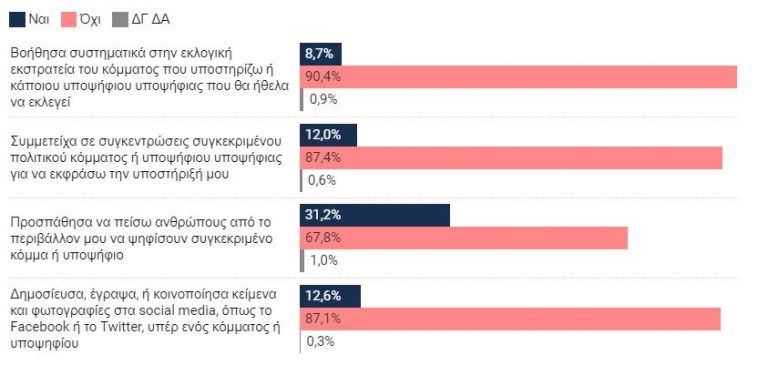 Η άρνηση να συμμετέχουν ενεργά στην προεκλογική διαδικασία φαίνεται και από την απάντηση σε ποσοστό 67,8% πως δεν «προσπάθησαν να πείσουν ανθρώπους από το περιβάλλον τους για να ψηφίσουν συγκεκριμένο κόμμα ή υποψήφιο/α» αλλά και σε ποσοστό 87% ότι δεν «δημοσίευσαν, έγραψαν, ή κοινοποίησαν κείμενα και φωτογραφίες στα social media, υπέρ ενός κόμματος ή υποψηφίου/ας».