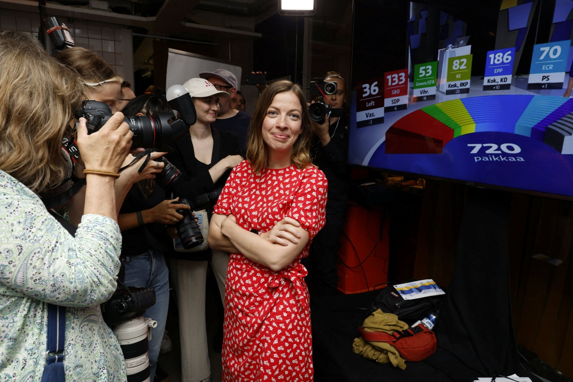 Φωτογραφία: Η ηγέτιδα της Αριστερής Συμμαχίας και υποψήφια για τις εκλογές Λι Άντερσον περιβάλλεται από μέσα ενημέρωσης στο τέλος της δεξίωσης της Αριστερής Συμμαχίας για τις εκλογές του Ευρωπαϊκού Κοινοβουλίου στο Ελσίνκι.