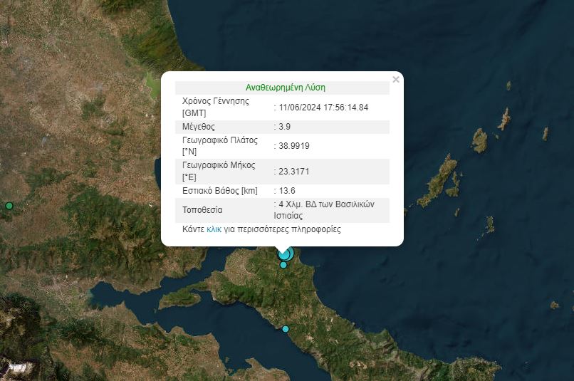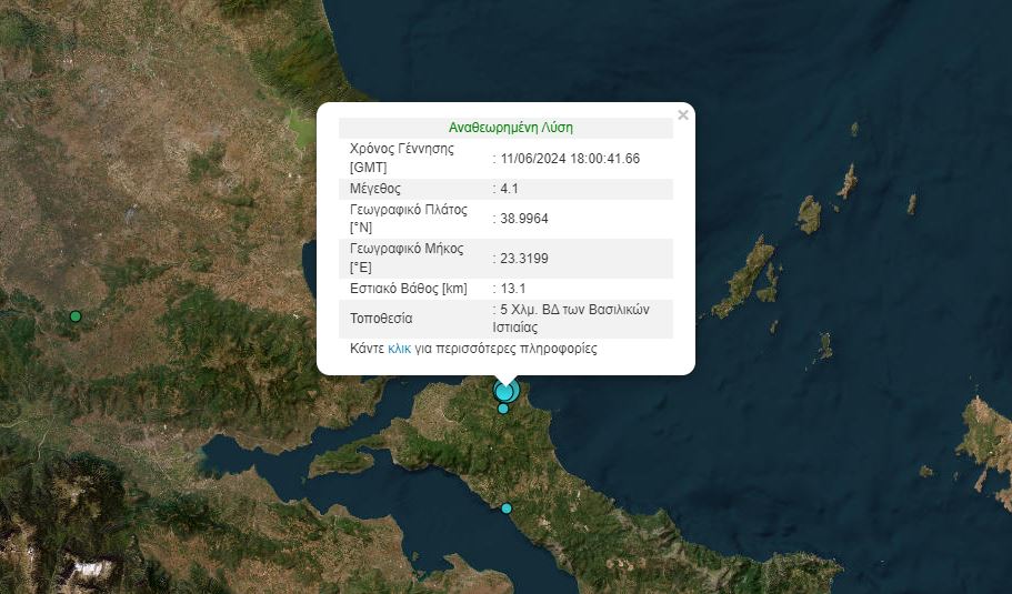 Δυο σεισμοί, ο πρώτος μεγέθους 3,9 βαθμών στην κλίμακα Ρίχτερ και ο δεύτερος 4,1, σημειώθηκαν το βράδυ της Τρίτης (11/6) στην Ιστιαία.
