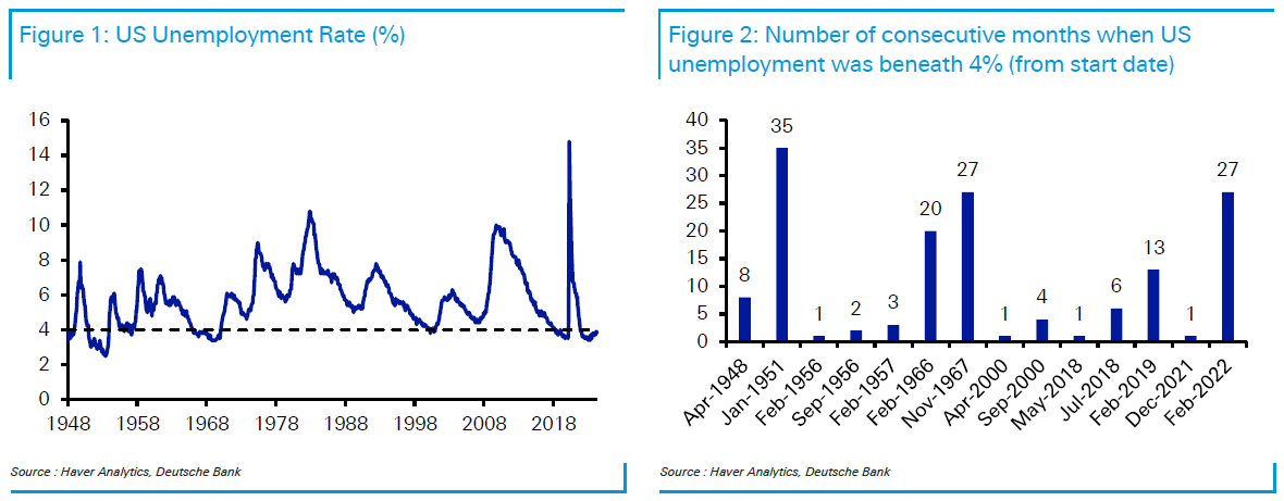 Για παράδειγμα, υπήρξαν τώρα 28 μήνες ανεργίας κάτω του 4% στις ΗΠΑ, η οποία είναι η μεγαλύτερη έκταση κάτω από το 4% από τα τέλη της δεκαετίας του 1960, όταν σημειώθηκε άλλη μια επέκταση 27 μηνών. Είναι ισάξια με την επέκταση 28 μηνών που παρατηρήθηκε τελευταία φορά στις αρχές της δεκαετίας του 1950.