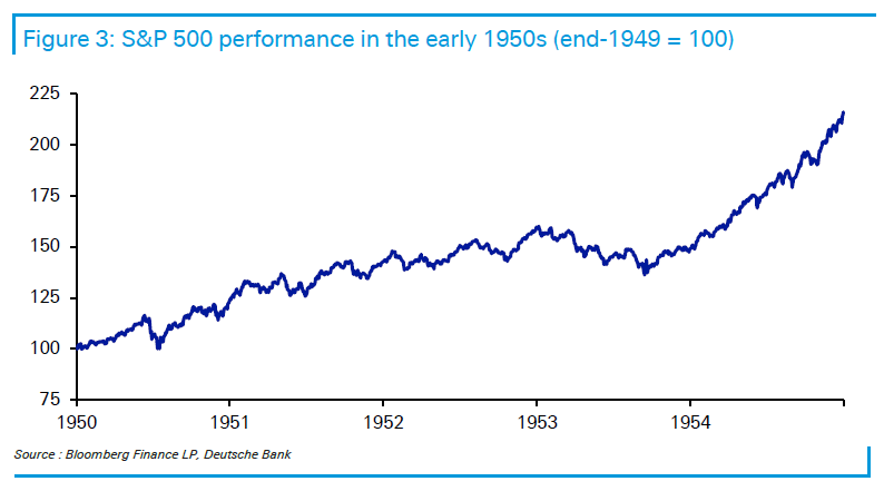 Στις αρχές της δεκαετίας του 1950, οι αγορές είδαν μια πολύ ισχυρή απόδοση, με τον S&P 500 να υπερδιπλασιάζεται μεταξύ των αρχών του 1950 και του τέλους του 1954. Επιπλέον, αυτό συνέβη παρά την ύφεση των ΗΠΑ το 1953-54.