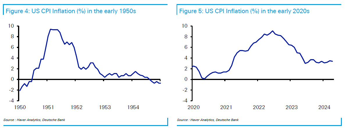 Ενώ υπάρχουν πολλοί παραλληλισμοί με τις αρχές της δεκαετίας του 1950, δεν πρέπει να υπερβάλλουμε τη σύγκριση, αναφέρει η Deutsche Bank. Μια σημαντική διαφορά είναι ότι στις αρχές της δεκαετίας του 1950, υπήρχε ακόμη μια σημαντική απομόχλευση μετά τον Β’ Παγκόσμιο Πόλεμο, με το δημόσιο χρέος των ΗΠΑ να μειώνεται σημαντικά. Αυτό είναι πολύ διαφορετικό από το σημερινό περιβάλλον, όπου ο λόγος δημόσιου χρέους προς ΑΕΠ έχει ανοδική τάση τις τελευταίες δεκαετίες.