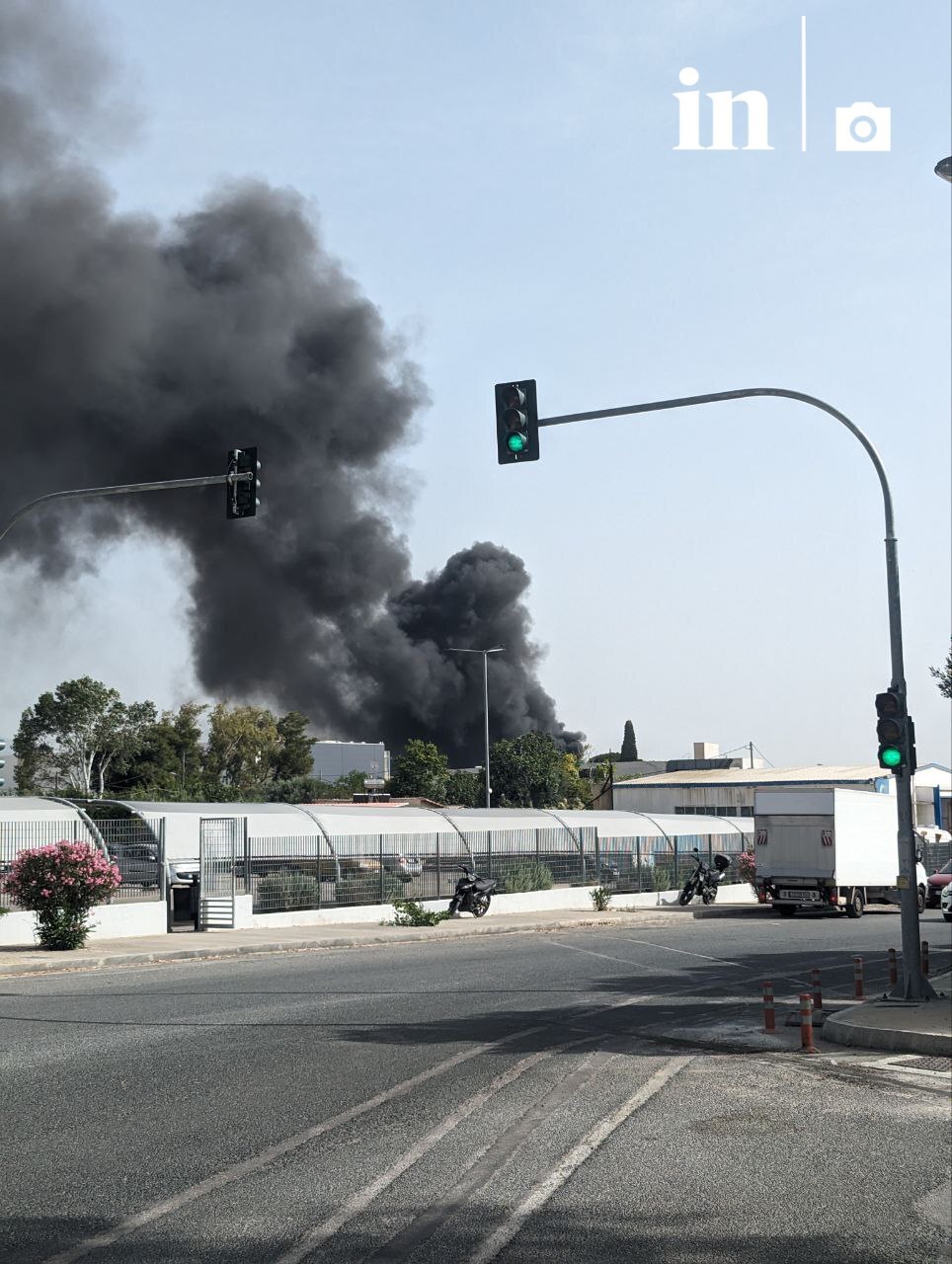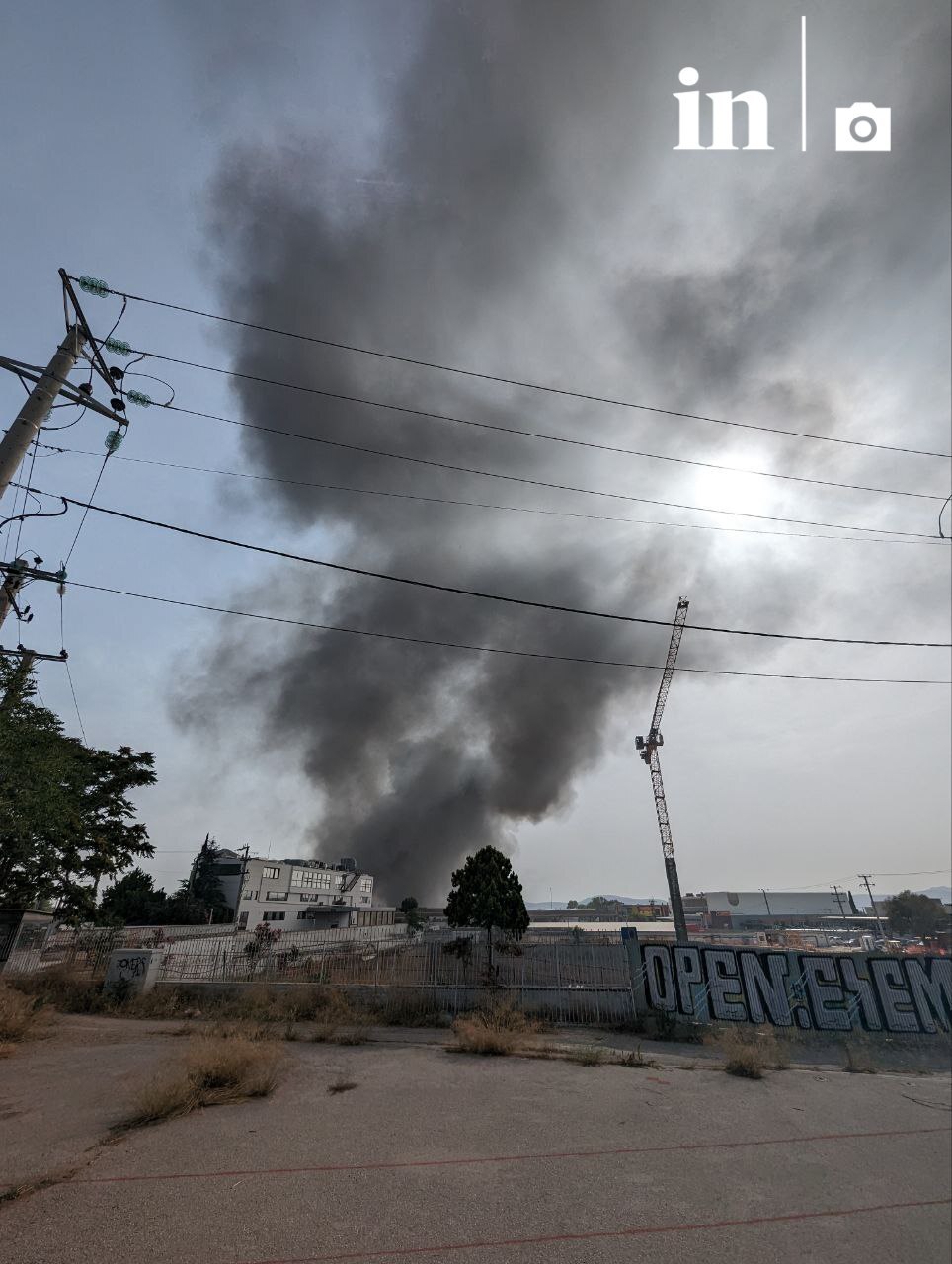 Εικόνες αποκάλυψης από το φλεγόμενο εργοστάσιο στην Κάτω Κηφισιά. Η μυρωδιά είναι έντονη, ενώ ορατό είναι από μεγάλη απόσταση και το μεγάλο, μαύρο σύννεφο καπνού.