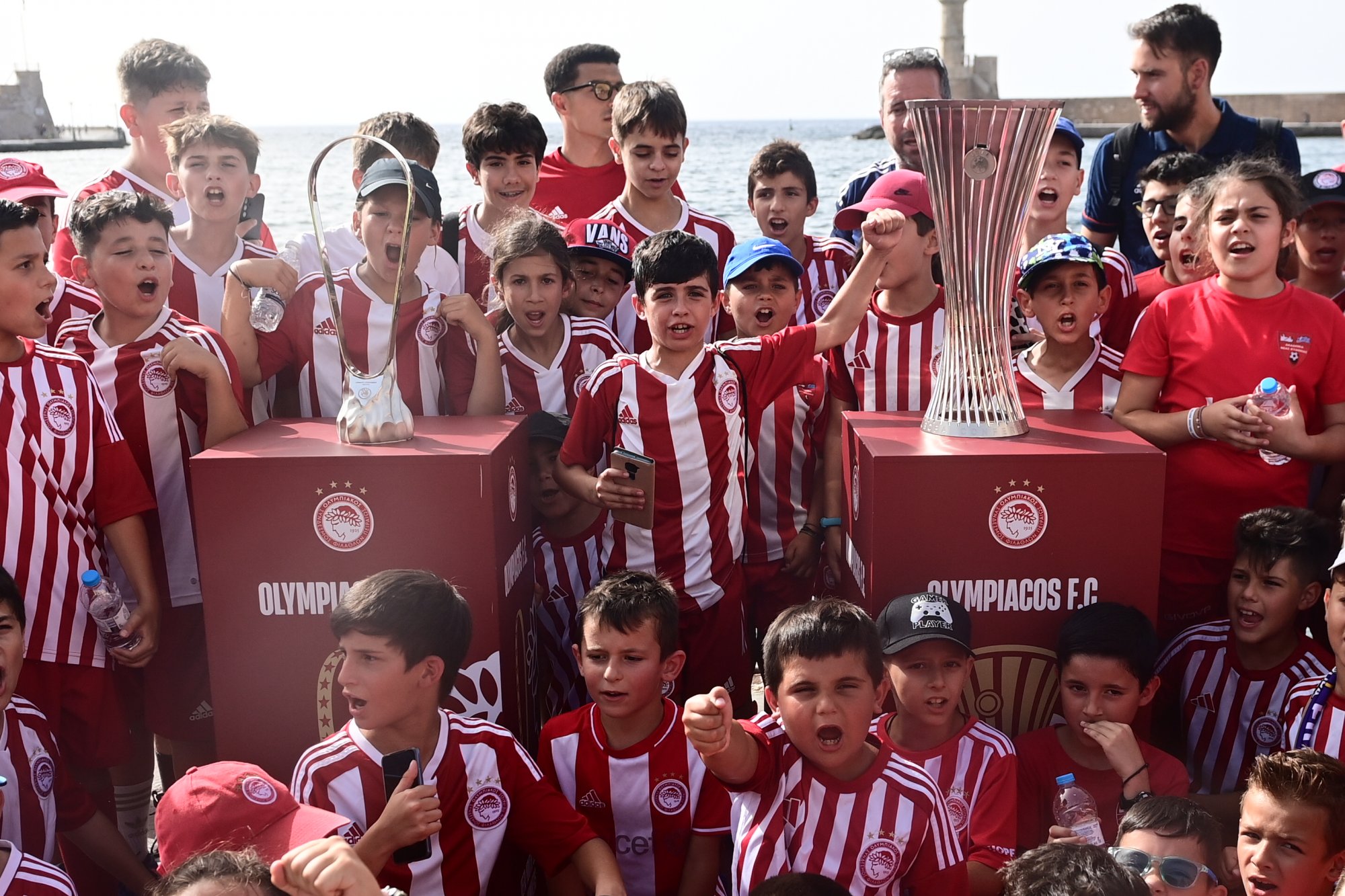 Χιλιάδες φίλοι του Ολυμπιακού βρέθηκαν από νωρίς το απόγευμα της Τετάρτης (12/6) στο εμβληματικό παλιό λιμάνι των Χανίων για να φωτογραφηθούν με τα δύο ευρωπαϊκά τρόπαια που κατέκτησε φέτος ο σύλλογος του μεγάλου λιμανιού. Οι ενθουσιασμένοι φίλαθλοι των ερυθρόλευκων, αλλά και παιδιά των σχολών της ομάδας στα Χανιά, δημιούργησαν εντυπωσιακή ατμόσφαιρα και τραγούδησαν συνθήματα, κρατώντας στα χέρια τους σημαίες και κασκόλ.