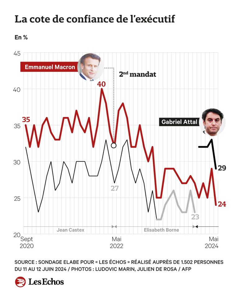 «Τα ευρήματα της δημοσκοπικής έρευνας δεν αποτελούν έκπληξη μετά από μια εκλογική αποτυχία τέτοιου μεγέθους, που επισκίασε τα θετικά για το προφίλ του προέδρου γεγονότα της προηγούμενης εβδομάδας, τις τελετές για τα 80 χρόνια από την απόβαση των Συμμάχων στη Νορμανδία και την επίσκεψη του αμερικανού προέδρου Τζο Μπάιντεν. Στη συνείδηση των Γάλλων ψηφοφόρων είναι η εκλογική πανωλεθρία της Κυριακής που επικρατεί», εξήγησε στη «Les Echos» ο Μπερνάρ Σανανές, πρόεδρος της εταιρείας Elabe που διενήργησε τη δημοσκόπηση.