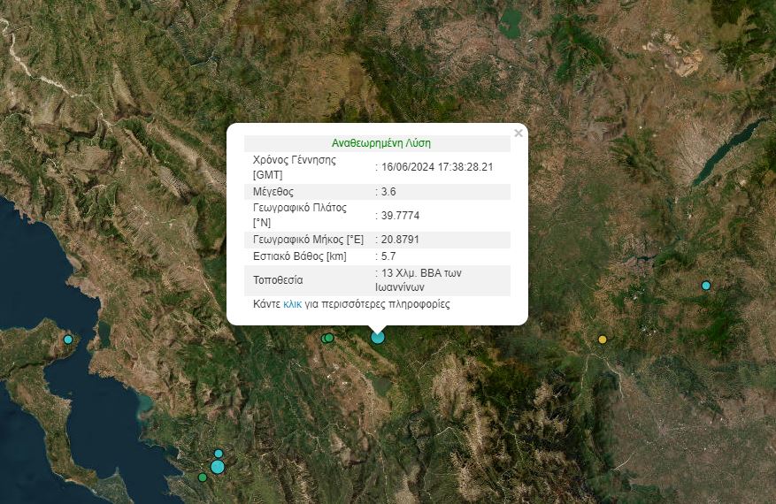 Σεισμός, μεγέθους 3,6 βαθμών στην κλίμακα Ρίχτερ, έγινε το βράδυ της Κυριακής (16/6) κοντά στα Ιωάννινα.