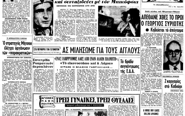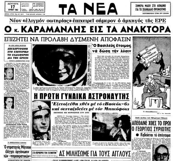 Στο πρωτοσέλιδο των «Νέων» που είχαν κυκλοφορήσει στις 17 Ιουνίου 1963, ημέρα Δευτέρα, υπήρχε το θλιβερό αγγελτήριο θανάτου του Γεωργίου Συριώτη, διευθυντή της εφημερίδας «Το Βήμα», εξέχουσας μορφής της ελληνικής δημοσιογραφίας και ευρύτατα καλλιεργημένου πνευματικού ανθρώπου.