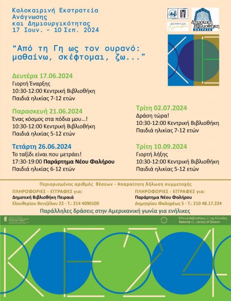 Σε ένα συναρπαστικό ταξίδι αναζήτησης, με σύνθημα: «Από τη Γη ως τον ουρανό: μαθαίνω, σκέφτομαι, ζω…», οι μικροί Πειραιώτες θα έχουν την ευκαιρία να συμμετάσχουν δωρεάν σε δράσεις με διαφορετικές θεματικές, από τη Δευτέρα 17 Ιουνίου έως και την Τρίτη 10 Σεπτεμβρίου 2024.