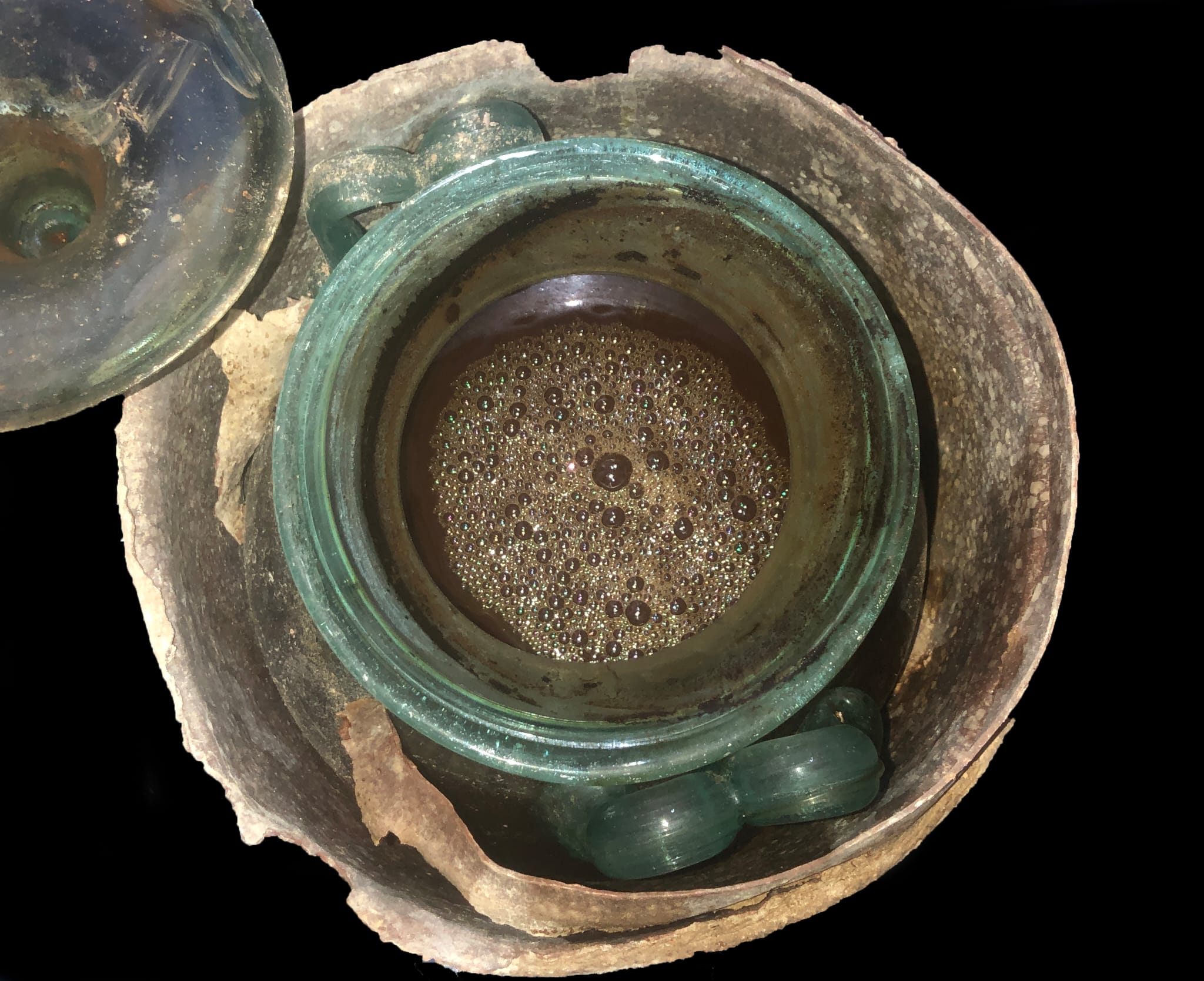 Στο πλαίσιο αυτού του τελετουργικού της κηδείας, τα σκελετικά λείψανα ενός από τους άνδρες βυθίστηκαν σε ένα υγρό μέσα σε μια γυάλινη τεφροδόχο και τοποθετήθηκαν στη λάρνακα. Το υγρό απέκτησε μια κοκκινωπή απόχρωση με την πάροδο του χρόνου και διατηρήθηκε με αυτόν τον τρόπο από τον 1ο αιώνα μ.Χ.