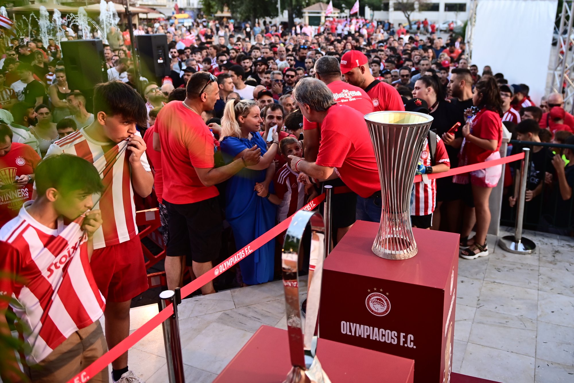 Μοναδικές στιγμές, με τους φίλους του Ολυμπιακού να απαθανατίζονται δίπλα στα τρόπαια του Europa Conference League και Youth League.
