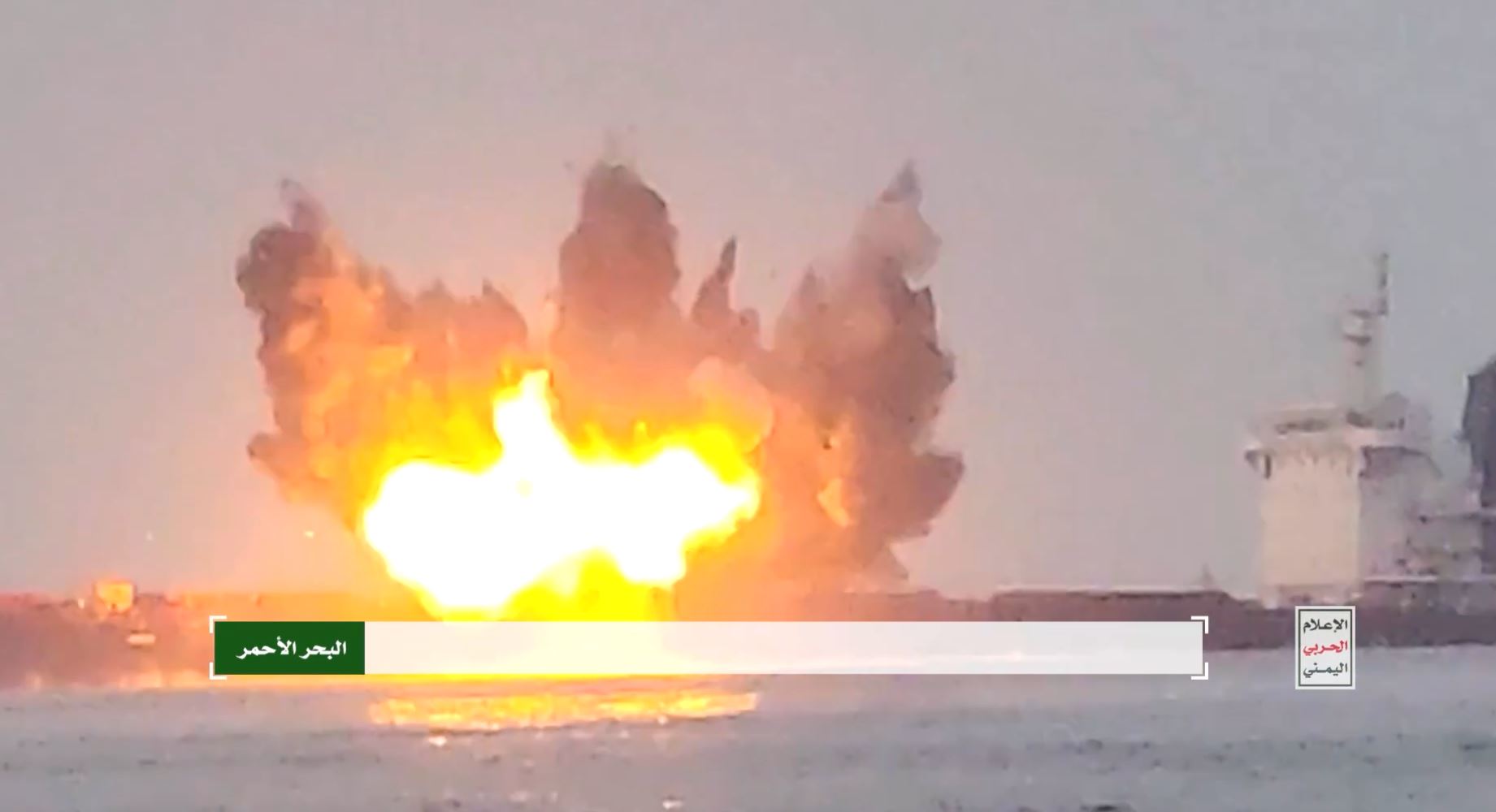 مشاهد استهداف سفينة (TUTOR) بزورقين مسيرين في البحر الأحمر وإغراقها..