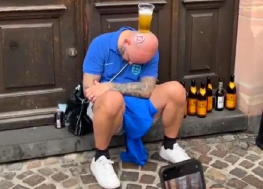 Ένας μεθυσμένος Άγγλος οπαδός κοιμόταν… όρθιος σε πεζούλι πριν τον αγώνα των «Τριών Λιονταριών» κόντρα στη Δανία για τη δεύτερη αγωνιστική των ομίλων του Ευρωπαϊκού πρωταθλήματος και κάποιοι συμπατριώτες του του στερέωσαν μία μπύρα στο κεφάλι.