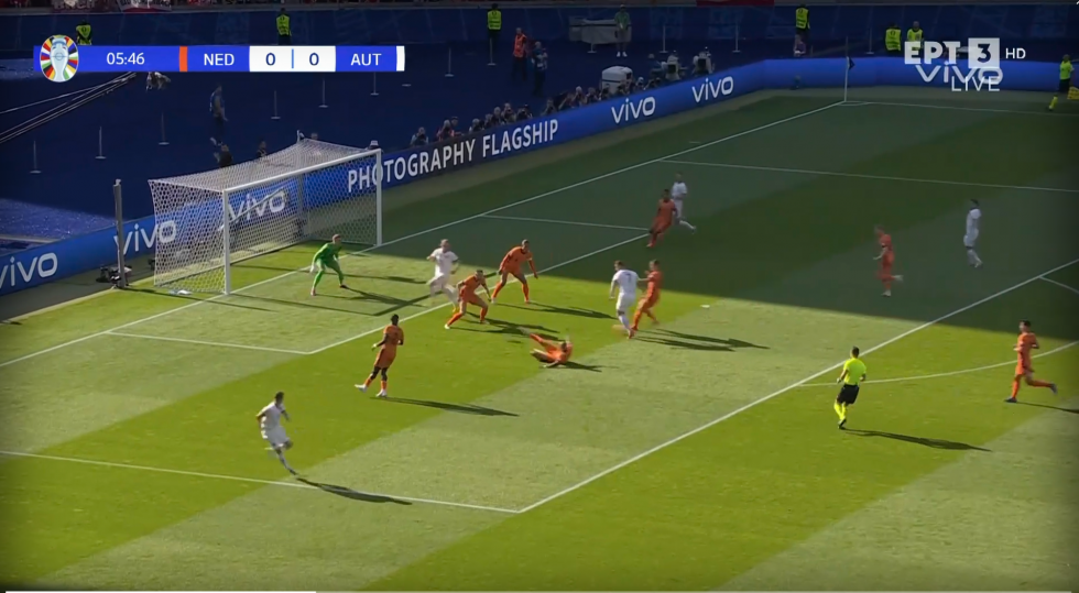 Ακόμα ένα αυτογκόλ στο φετινό Euro. Ο Μάλεν προσπάθησε να κόψει το γύρισμα του Πρας, ο επιθετικός της Ολλανδίας έκανε την προβολή, όμως άθελά του σκόραρε στην εστία της ομάδας του, νικώντας τον Φερμπρούχεν για το 1-0 της Αυστρίας.