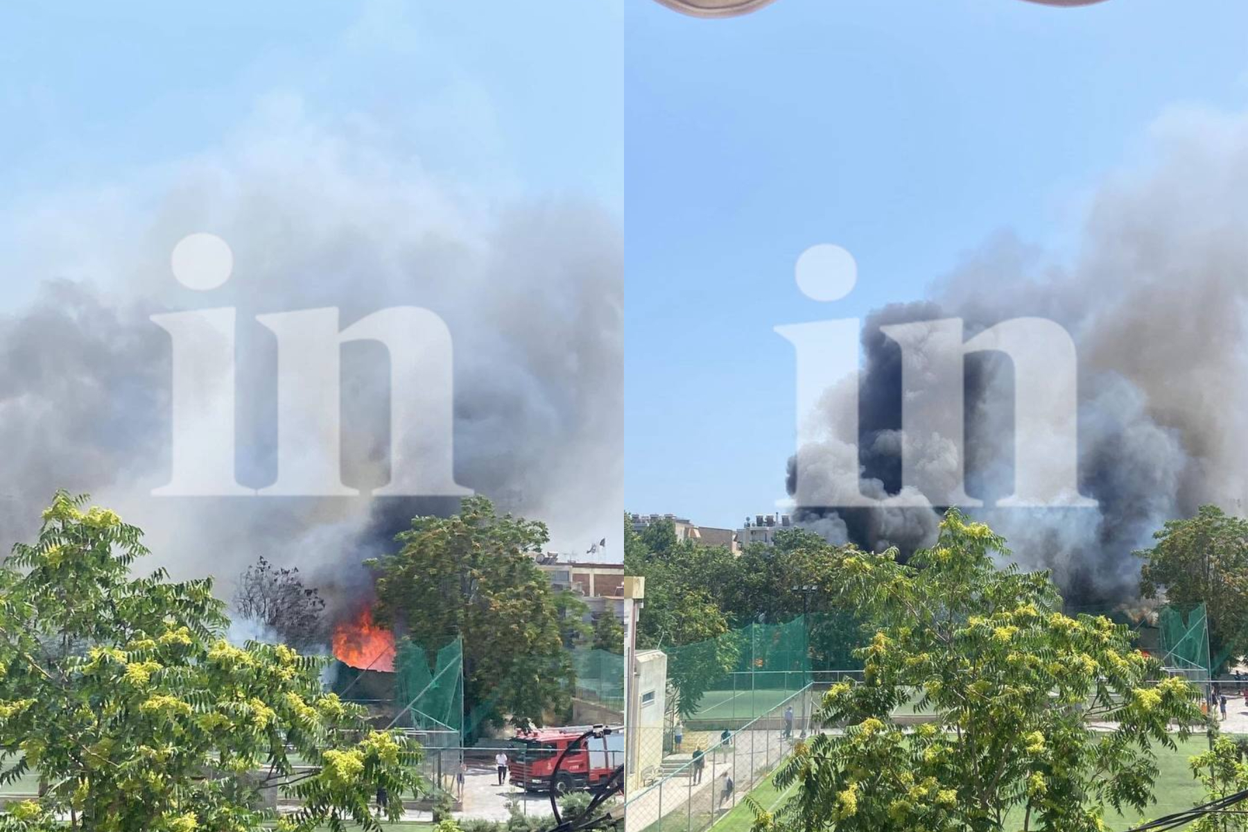 Μεγάλη φωτιά έχει ξεσπάσει σε εργοστασιακό χώρο στο Μοσχάτο, επί της οδού Κεφαλληνίας, πίσω από το Δημοτικό γήπεδο της περιοχής.