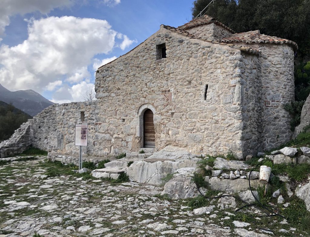 Την Παναγία του Κάστρου, έναν μικρό σταυροειδή εγγεγραμμένο ναό με τρούλο.