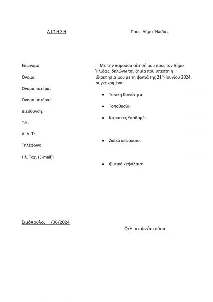 Οι αιτήσεις για καταστροφές σε ζωικό – φυτικό κεφάλαιο και υποδομές θα κατατίθενται στις δημοτικές υπηρεσίες της Δ.Ε. Πηνείας που εδρεύουν στο Σιμόπουλο, με τους δημότες που επλήγησαν από τις φωτιές να συμπληρώνουν και να καταθέτουν το ειδικό έντυπο και τα απαραίτητα δικαιολογητικά.