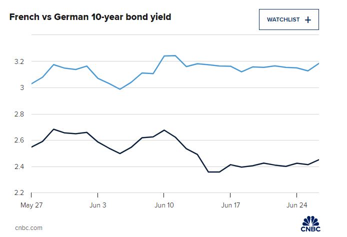 Οι αποδόσεις των γαλλικών ομολόγων – οι οποίες κινούνται αντιστρόφως ανάλογα με τις τιμές – είναι σχετικά συγκρατημένες. Όμως, οι παρατηρητές της αγοράς έχουν επισημάνει το κόστος δανεισμού της Γαλλίας έναντι των γειτονικών της χωρών, ιδίως της Γερμανίας. Η διαφορά μεταξύ των αποδόσεων των γαλλικών και των γερμανικών 10ετών ομολόγων έχει αυξηθεί σε περισσότερες από 71 μονάδες βάσης από την προκήρυξη των εκλογών – η μεγαλύτερη εδώ και περισσότερο από μια δεκαετία, καθώς οι επενδυτές στοιχηματίζουν ότι η Γερμανία είναι χαμηλότερου κινδύνου.
